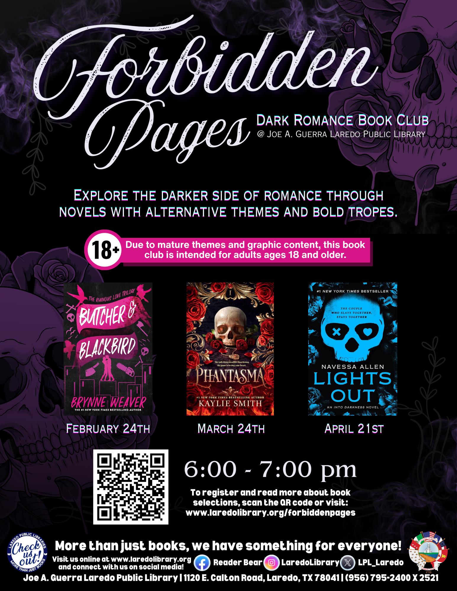 Joe A. Guerra Laredo Public Library 1120 E. Calton Rd, Laredo, TX, United StatesJoe. A Guerra Laredo Public LibraryAdults are invited to join us in reading and discussing these novels that explore romance with alternative themes and tropes for adults that enjoy darker reads.