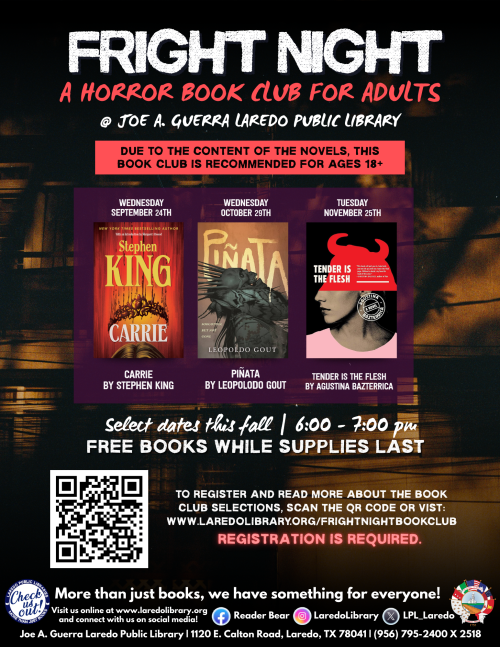 Join our horror book club for adults this spooky season! For more information about the books, go to www.laredolibrary.org/frightnightbookclub